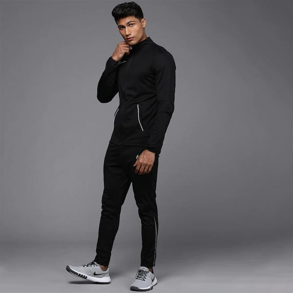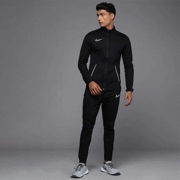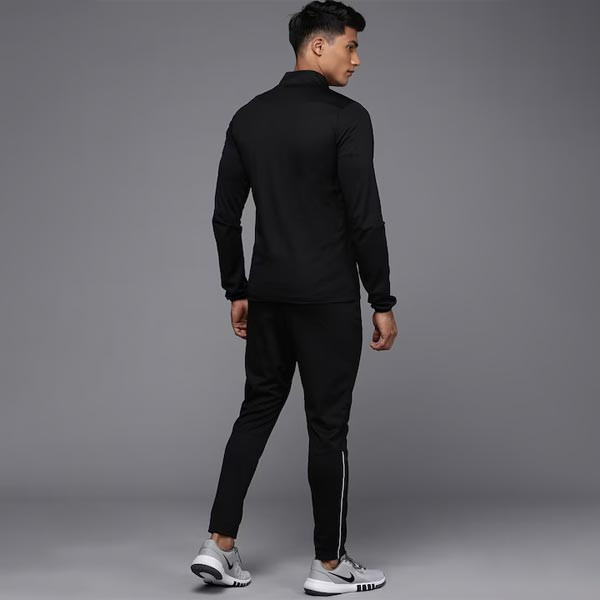 The Nike Dri-FIT Academy Tracksuit includes a zip-up jacket and adjustable pants so you can train in total comfort. Sweat-wicking fabric and mesh details help keep you dry and cool when practicing or traveling to and from games. Product design detail: Black tracksuit Black sweatshirt, has a mock collar, a zip closure, long sleeves, two kangaroo pockets Black track pants, has an elasticated waistband with drawstring closure, two pockets, cuffed hems with contrast linning Size & Fit The model (height 6') is wearing a size M Material & Care 100% POLYESTER Machine wash