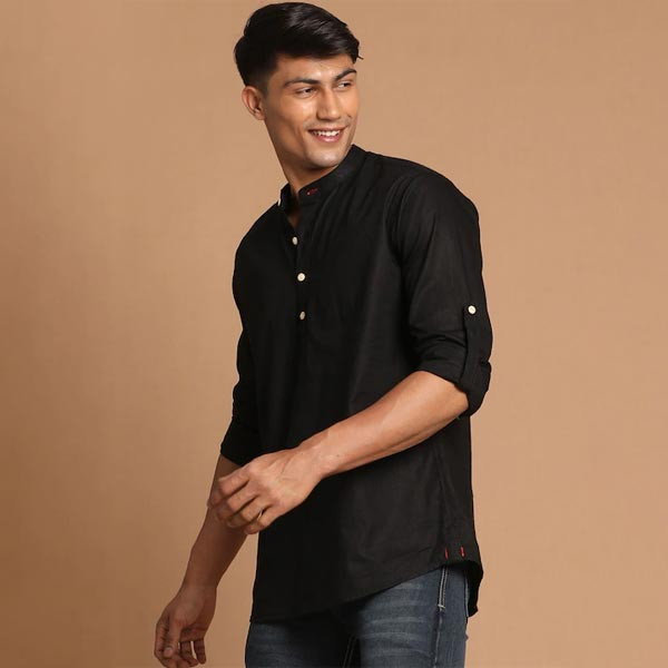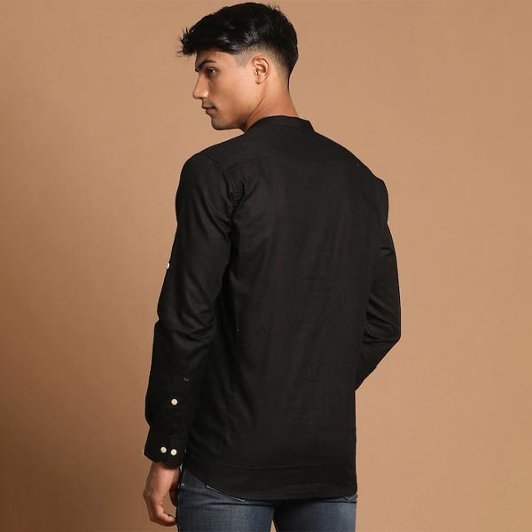 Colour: black Solid Mandarin collar Long, roll-up sleeves Straight shape with regular style Above knee with curved hem Machine weave regular cotton Size & Fit The model (height 6') is wearing a size M Material & Care Cotton Dry Clean