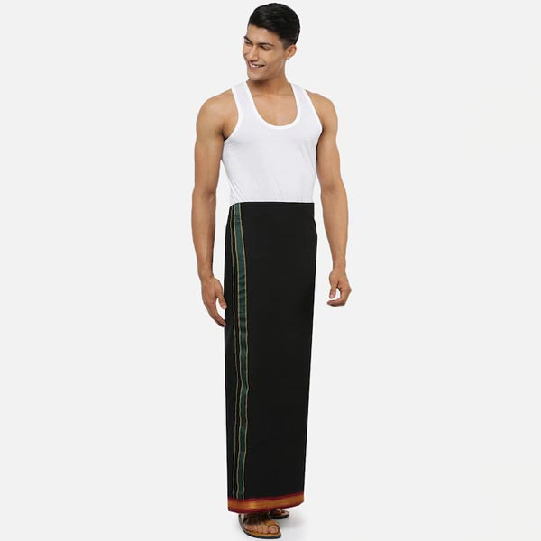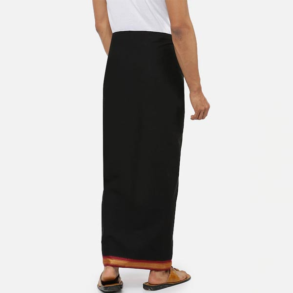 Black solid mid-rise dhoti, has a red and green sari border Size & Fit Length of Dhoti: 3.8 m Material & Care 100% Cotton Machine wash