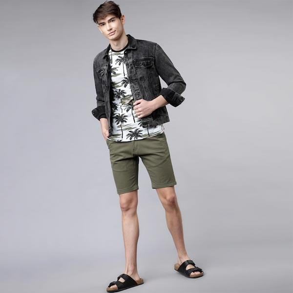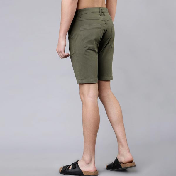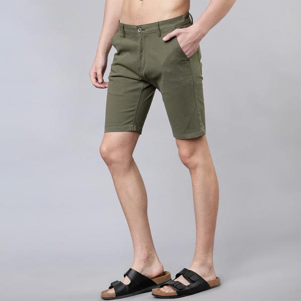 Olive green solid mid-rise regular shorts, has 4 pockets, and button closure Size & Fit Slim Fit The model (height 6') is wearing a size 32 Material & Care 98% Cotton 2% Elastane Machine-wash