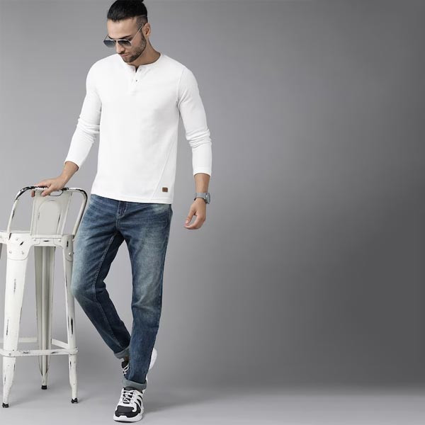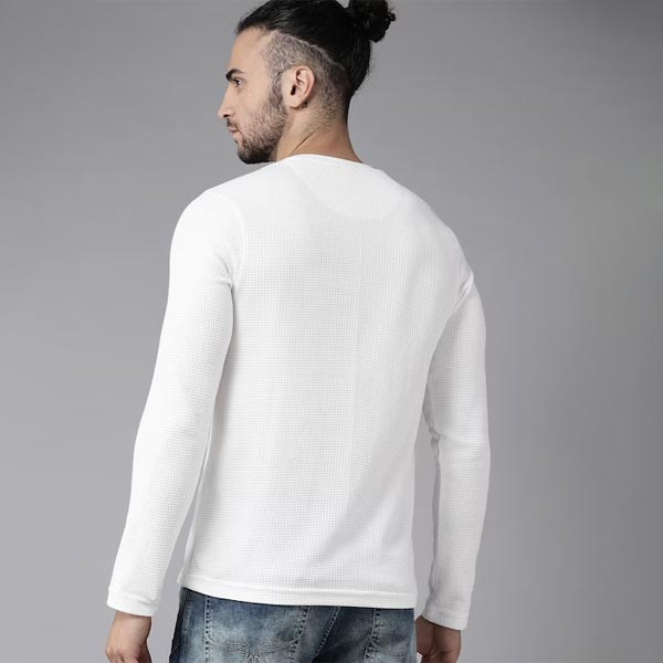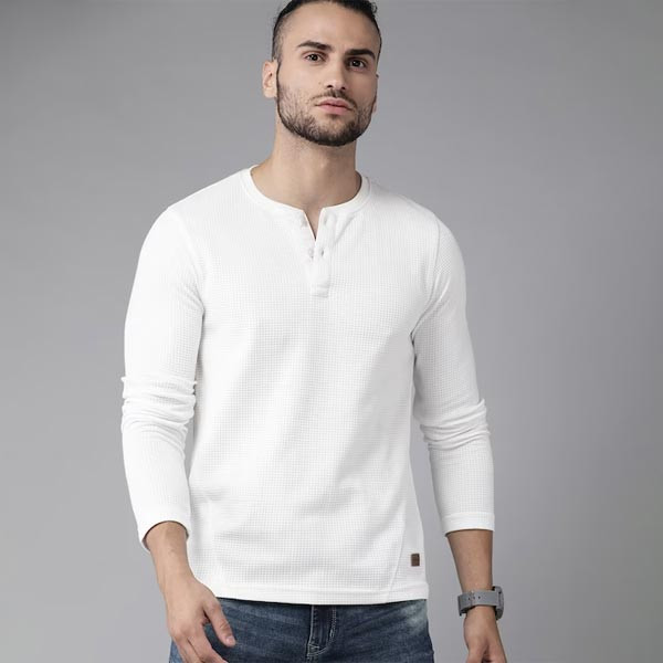 White Tshirt for men Self design Regular length Henley neck Long, regular sleeves Knitted cotton fabric Button closure Size & Fit Regular Fit Size worn by the model: M Chest: 38" Height: 6' Material & Care 60% Cotton & 40% Polyester Machine wash