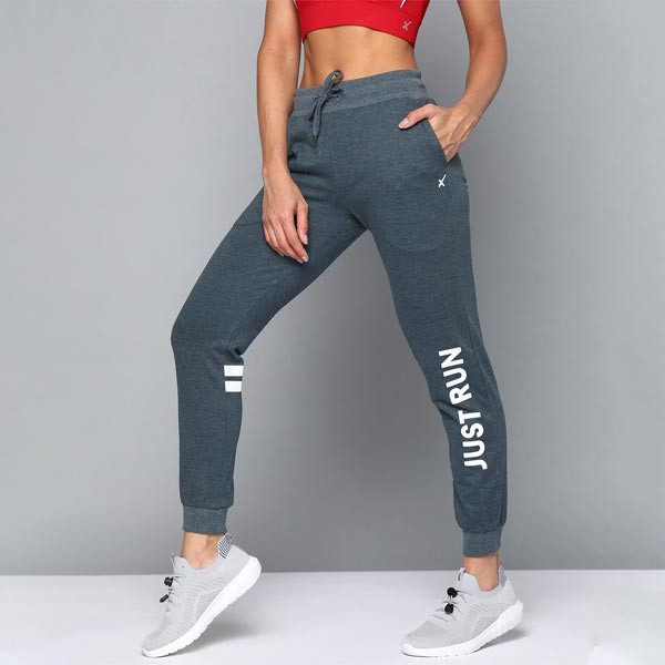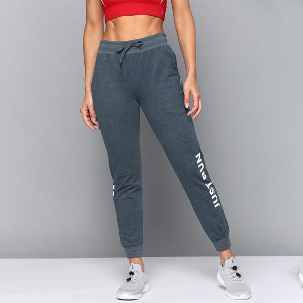 A pair of blue knitted mid-rise joggers with printed detail, has an elasticated waistband with a drawstring fastening, two pockets, cuffed hems