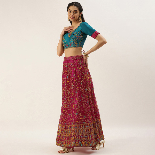 Embroidered unstitched blouse, has a round neck, short sleeves, pink and blue embroidered unstitched lehenga, flared hem