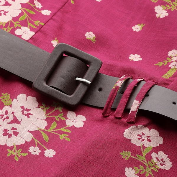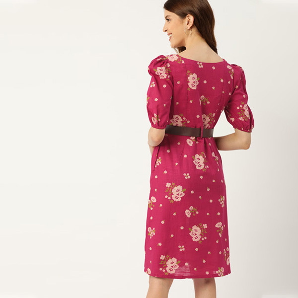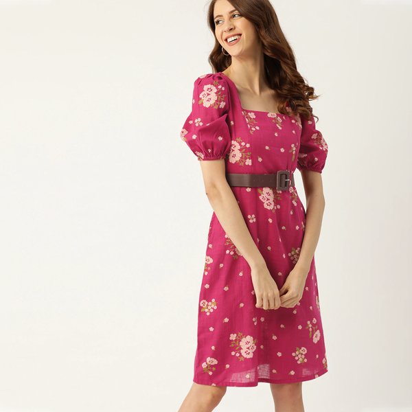 Magenta and Green printed woven A-line dress, has a square neck, short sleeves, concealed zip closure, and straight hem