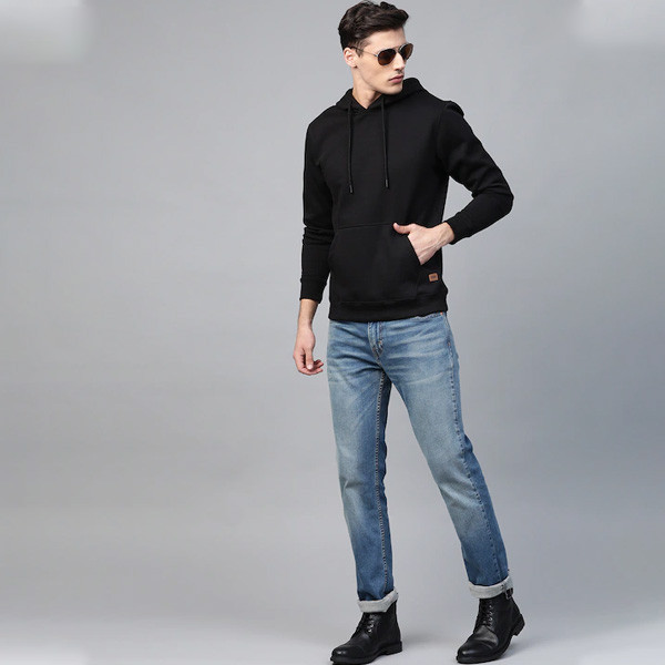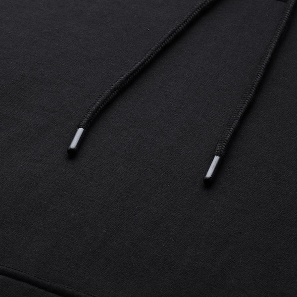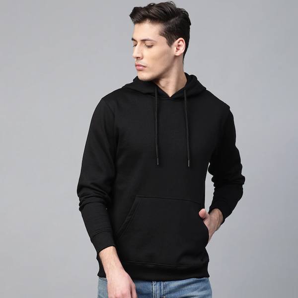 Black solid sweatshirt, has a hood, one pocket, long sleeves, ribbed hem