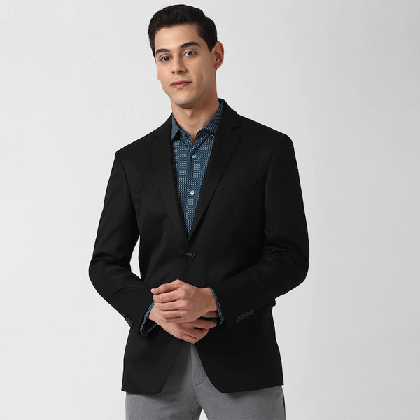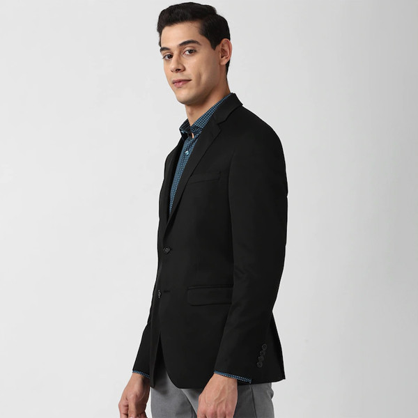 Black solid slim-fit single breasted blazer, has notched lapel collar, long sleeves, a full button placket and three pockets