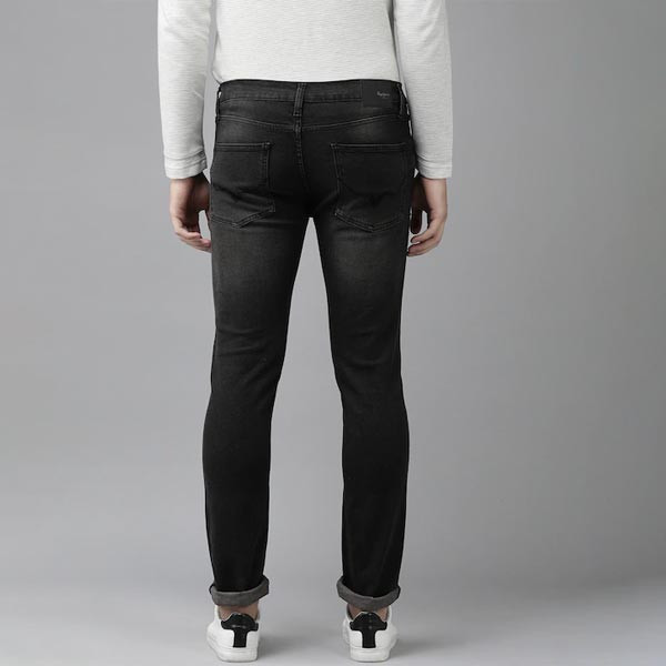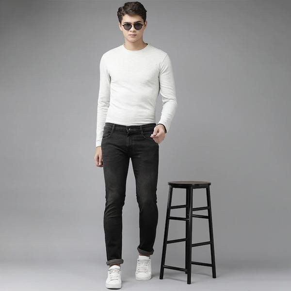 Dark shade, light fade black jeans Slim fit, mid-rise Slim Leg Brand Fit: vapour Clean look Stretchable 5 pockets Has whiskers and chevrons effect Length: regular Size & Fit Brand Fit: Vapour Fit: Slim Fit Stretchable The model (height 6') is wearing a size 32 Material & Care 98% Cotton, 2% Elastane Machine wash, cold