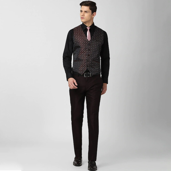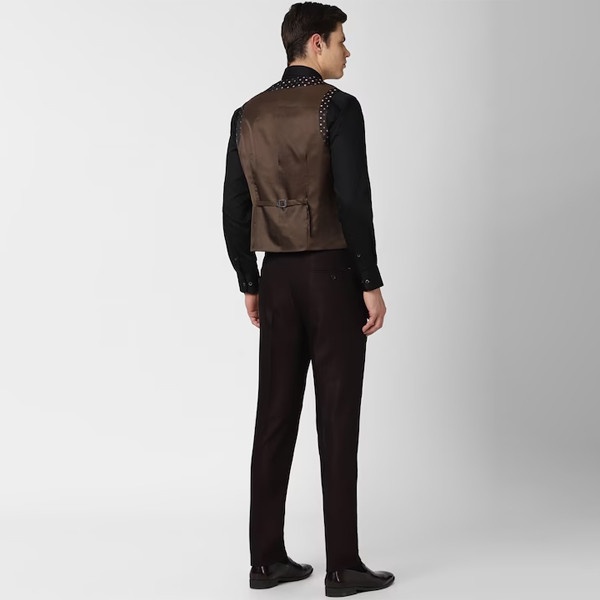 Brown printed waistcoat, has a V-neck, button closures on the front,2 pockets,adjustable belt on back,sleeveless