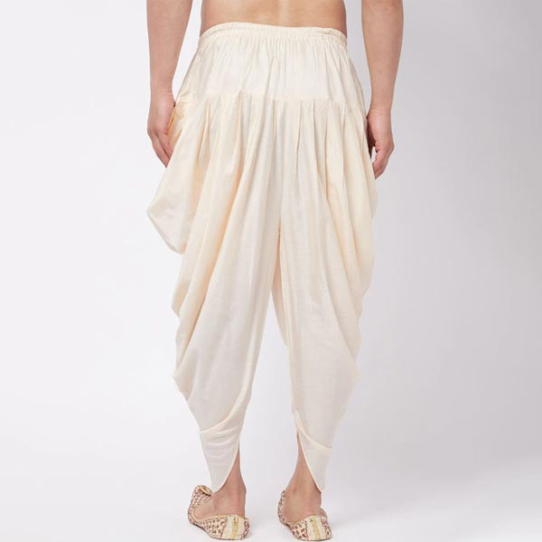 A pair of cream-coloured solid cowl dhoti pants with gathered and pleated detail, has an elasticated waistband, and drawstring closure Size & Fit Regular Fit The model (height 6') is wearing size S Material & Care Satin Blend Dry Clean preferably or cold light wash