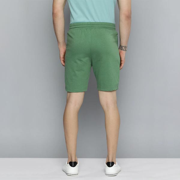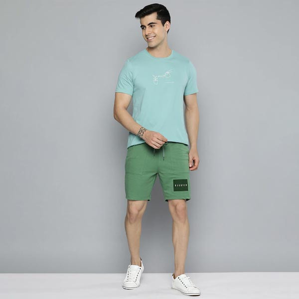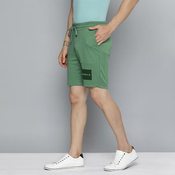 Green typography printed mid-rise regular shorts, has 2 pockets, drawstring closure Size & Fit Regular Fit The model (height 6') is wearing a size 32 Material & Care 70% Cotton 30% Polyester Machine wash