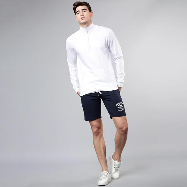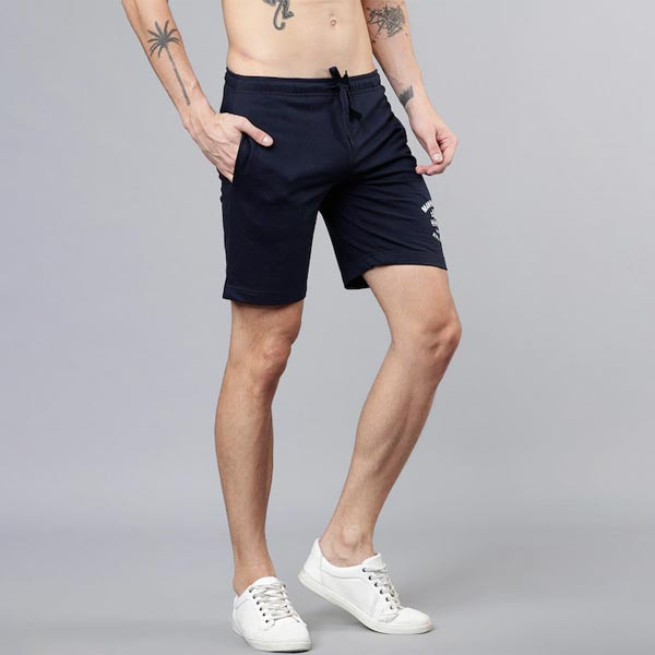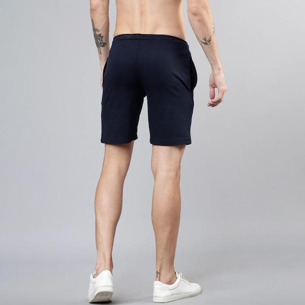 Navy Blue solid regular shorts, two pockets and drawstring closure Size & Fit Slim Fit The model (height 6') is wearing a size 32 Material & Care 52% Cotton 48% Polyester Machine wash