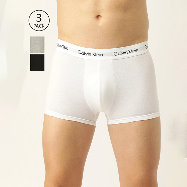 Pack of 3 solid trunks in Black, Grey and White, each has an outer elasticated low rise waistband, a double-layered contoured front pouch Disclaimer: The final product delivered might vary in colour and prints from the display here. Material & Care 95% Cotton and 5% elastane Machine Wash