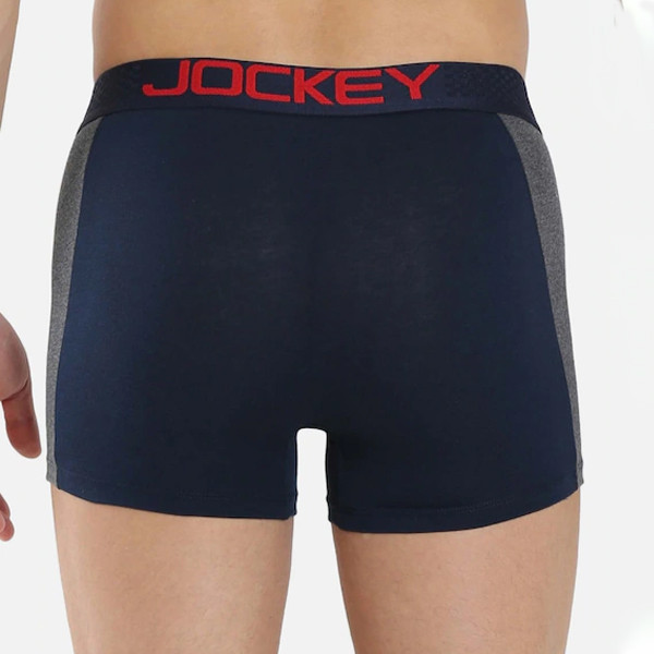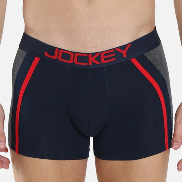 Navy Blue and Grey solid trunks Has an elasticated durable waistband Double-layered contoured front pouch Material & Care Combed Cotton elastane Gentle wash 40 degree C. Do not bleach. Do not wring. Tumble dry low. Do not iron. Do not dry clean. Wash inside out with like colours.
