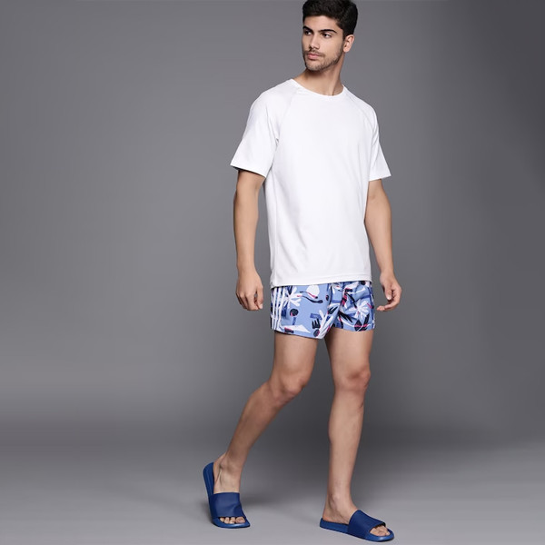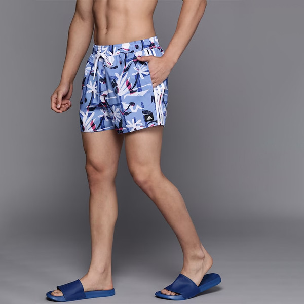 Blue and white printed swim shorts for men Above knee length Slip on closure with drawstring closure Abstract print Infused with durable, quick-drying, moisture-wicking material Warranty: 3 months from the date of purchase against manufacturing defects Warranty provided by brand/manufacturer Size & Fit The model (height 6') is wearing a size 38 Material & Care 100% Polyester Machine Wash