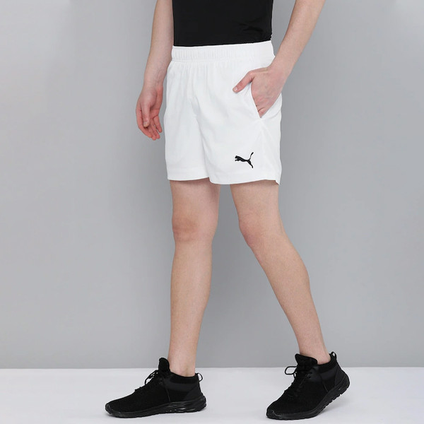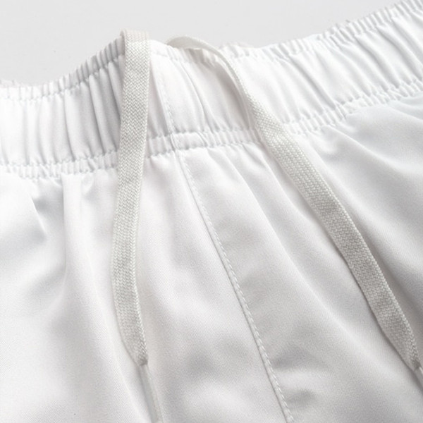 White solid mid-rise sports shorts, has 2 pockets, and drawstring closure