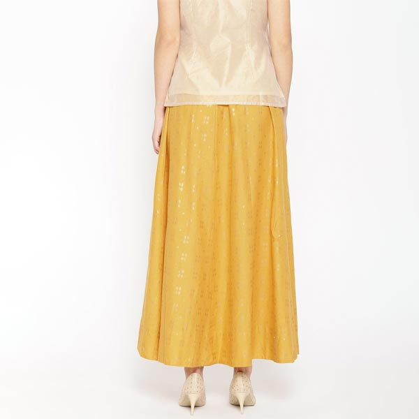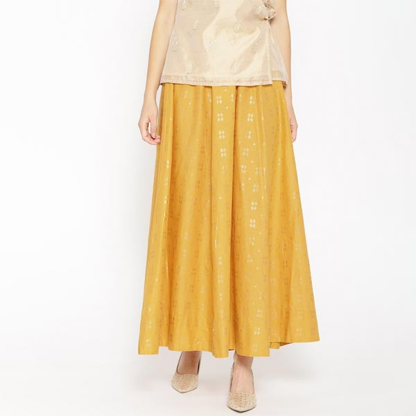 Mustard yellow and golden printed maxi A-line skirt, has an elasticated waistband