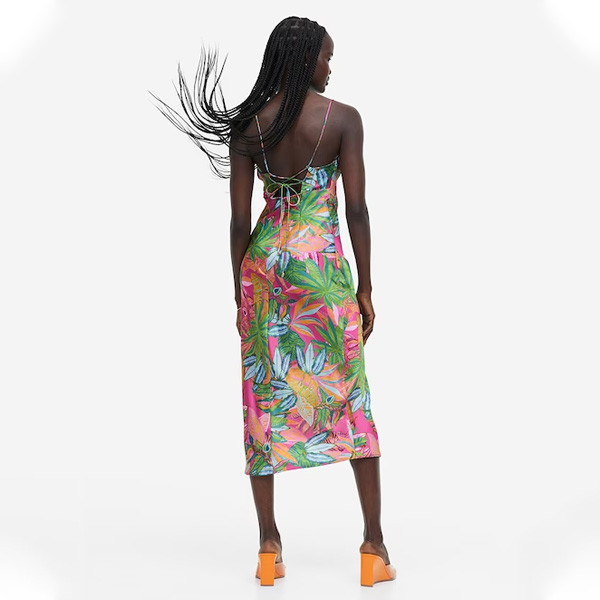 Calf-length, fitted dress in softly draping satin with a luscious, all-over floral print. Square neckline and a gathered seam under the bust creating a ruched effect. Narrow shoulder straps that thread through the sides and tie at the partially open back. Hook-and-eye fastening and a concealed zip at the back. High slit at one side of the front. Lined.