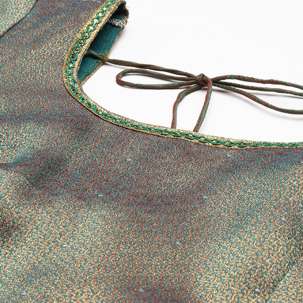 Teal and golden woven design unstitched blouse, sleeveless, mustard yellow woven design unstitched lehenga, flared hem
