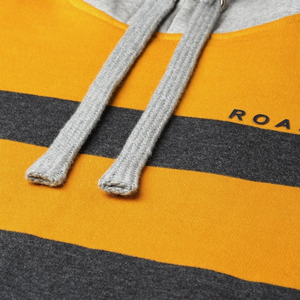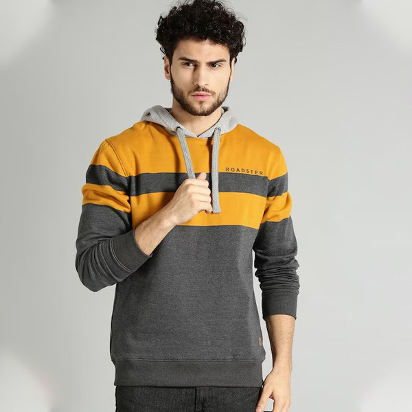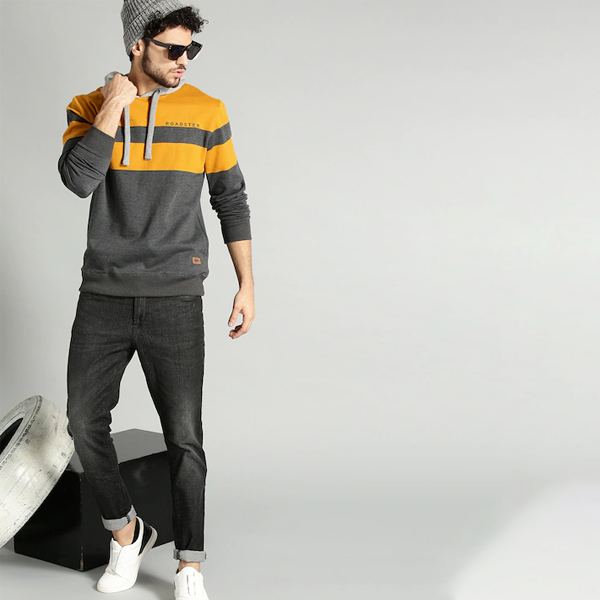 Charcoal grey and mustard yellow colourblocked sweatshirt, has a hood, long sleeves, two pockets, and ribbed hem