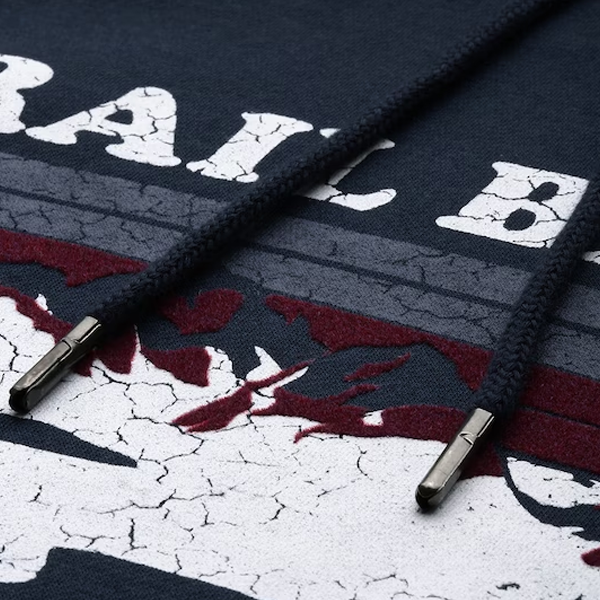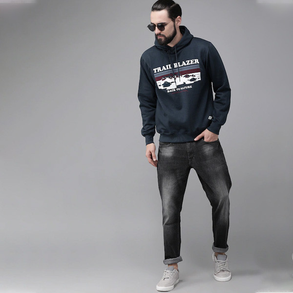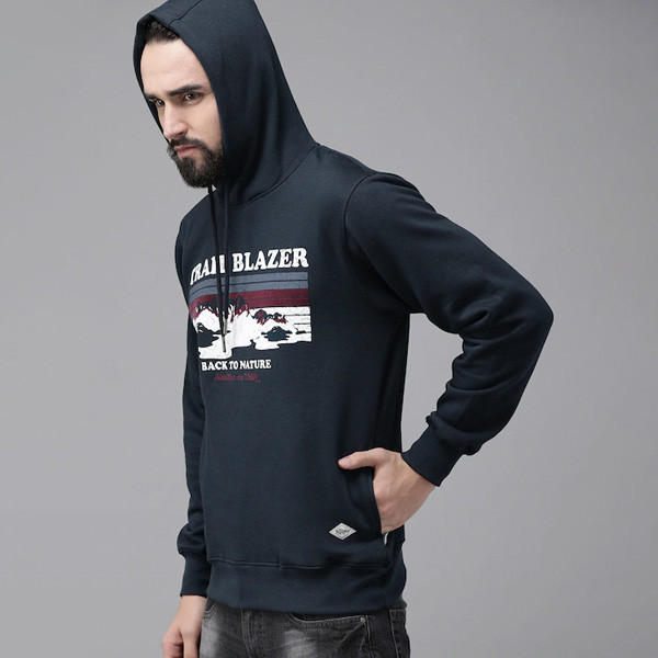Navy Blue printed sweatshirt, has a hood, two pockets, long sleeves, straight hem