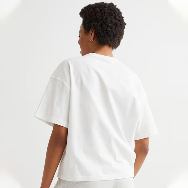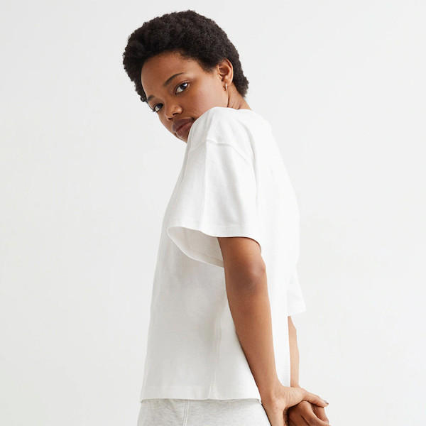 Boxy T-shirt in soft cotton jersey with a round, rib-trimmed neckline, dropped shoulders and wide sleeves that finish just above the elbow.