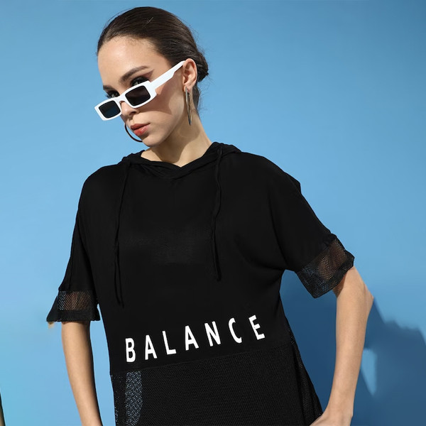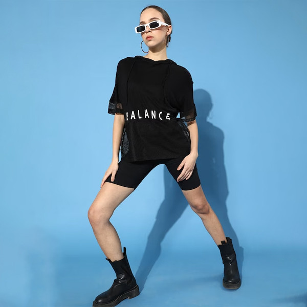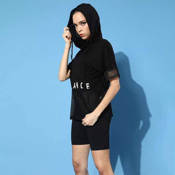 Black printed semi-sheer T-shirt, has a hood, short sleeves