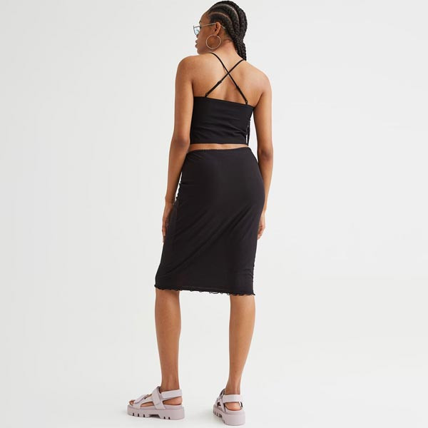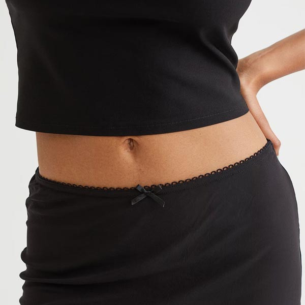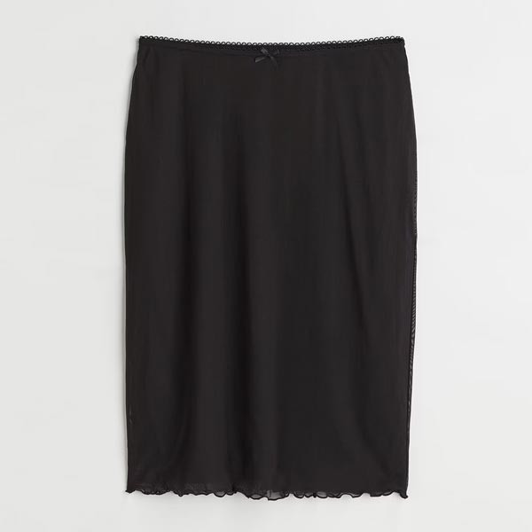 Fitted, knee-length skirt in mesh. Waist with concealed elastication, a scalloped trim and small satin bow at the front. Overlocked hem. Lined.