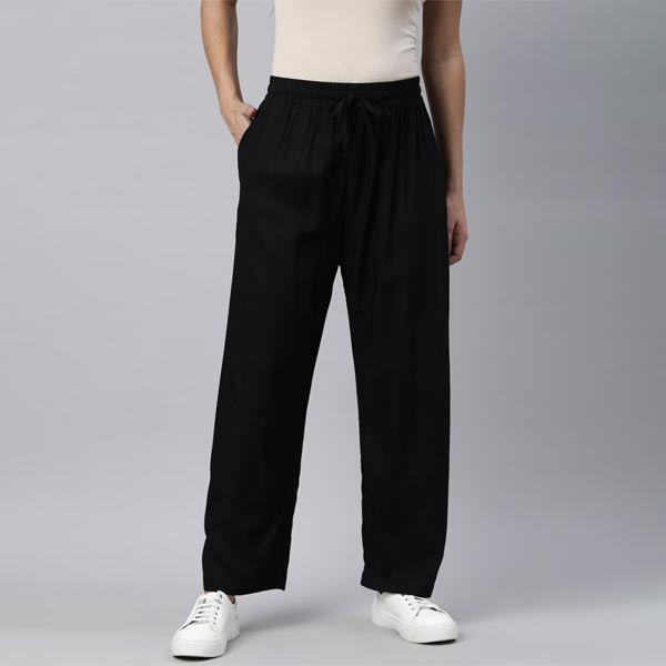 Black Woven palazzos, Solid Opaque and wide leg fit Elasticated waistband, Length : regular, Woven viscose rayan fabric and one welt pocket on wearers right side