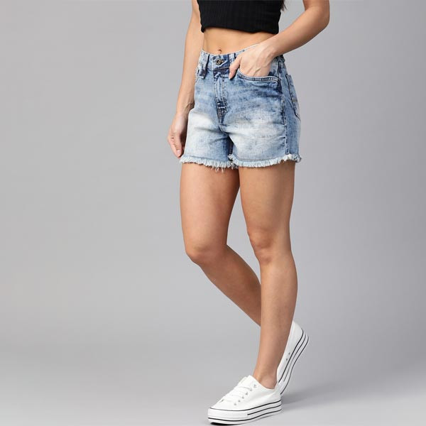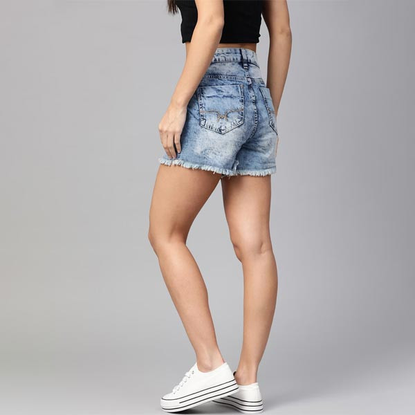 Blue washed mid-rise denim shorts, has 5 pockets, button closure, zip fly, frayed hems