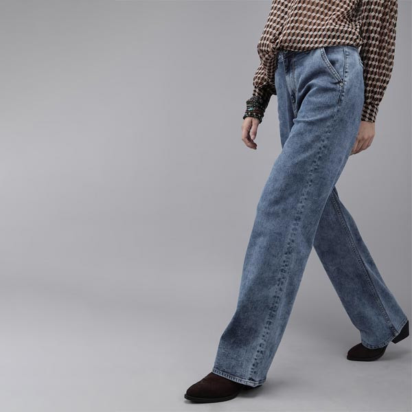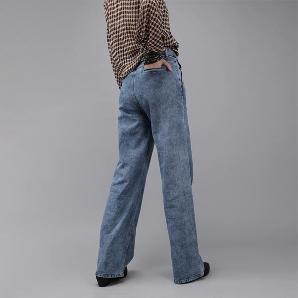 Blue medium wash 5-pocket high-rise jeans, clean look, heavy fade, has a button and zip closure, and waistband with belt loops