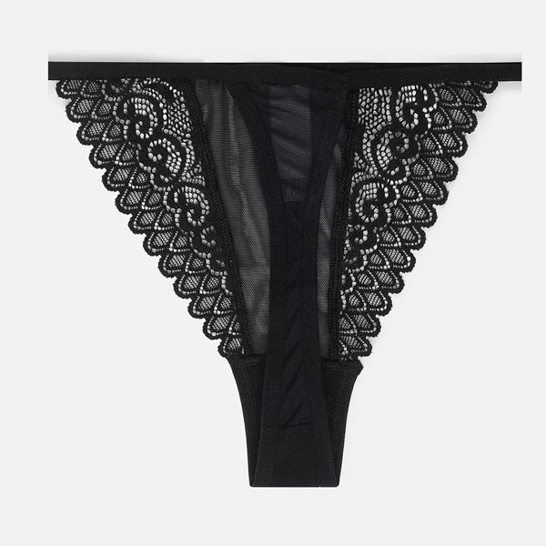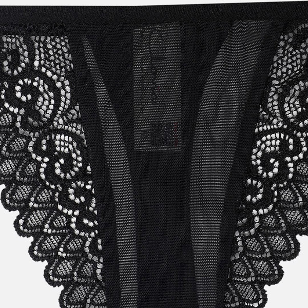 Black solid lace low-rise thongs brief, has elasticated waistband with double layered gusset