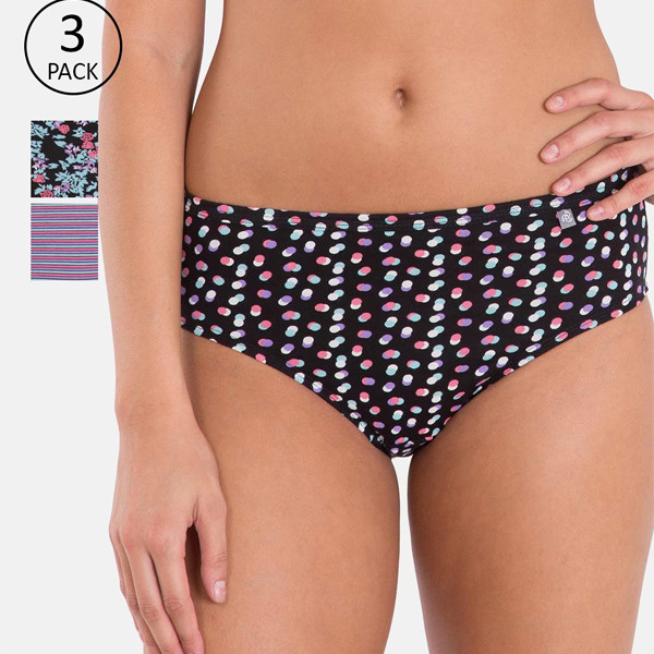 A pack of three hipster briefs in assorted colours and prints, each has an elasticated waistband, printed branding on the front, double-layered gusset, elasticated leg openings