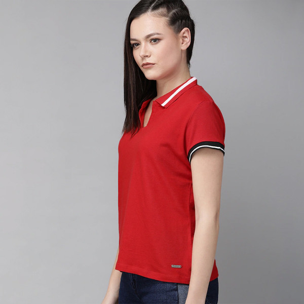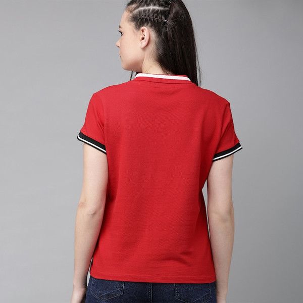 Red solid T-shirt with contrast tipping, has a polo collar, and short sleeves