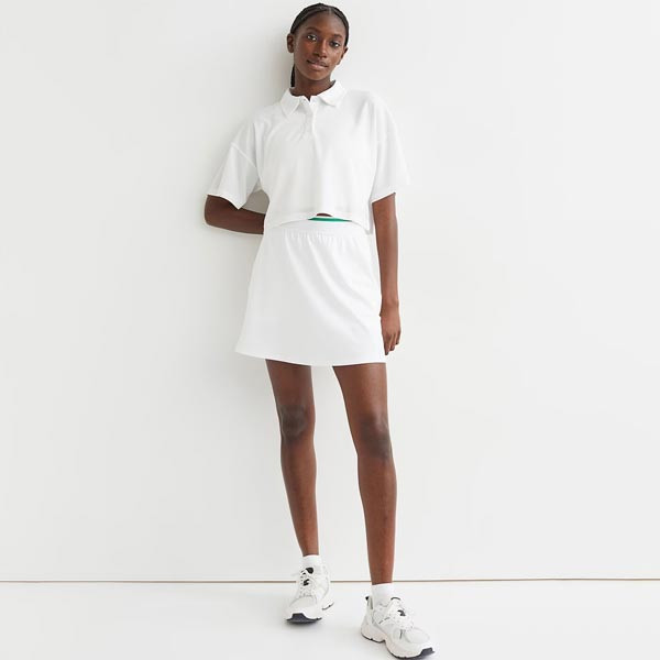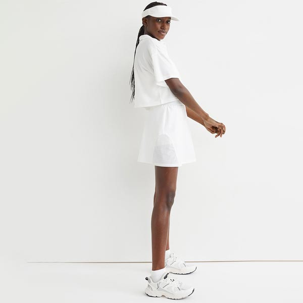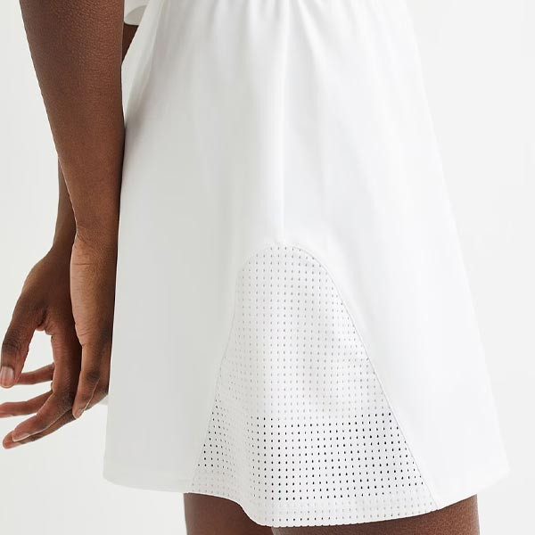 Short, A-line tennis skirt in fast-drying functional fabric designed to help keep you dry and cool while exercising. Wide, elasticated waistband, and a mesh section at each side for added ventilation. The skirt is layered over a pair of shorts that have a mobile phone pocket on one leg.