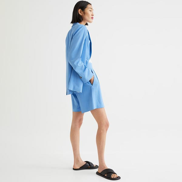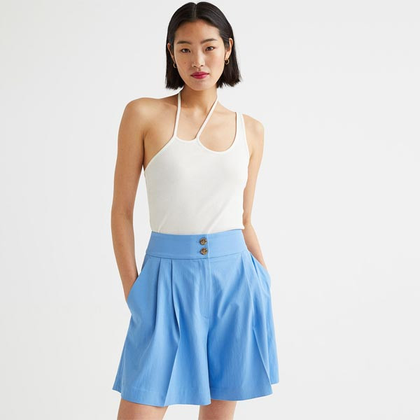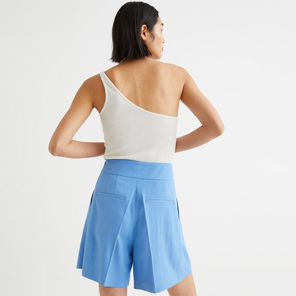 Wide shorts in softly draping twill. High waist with pleats, a zip fly and button, diagonal side pockets and fake welt back pockets. Relaxed fit. Lined.
